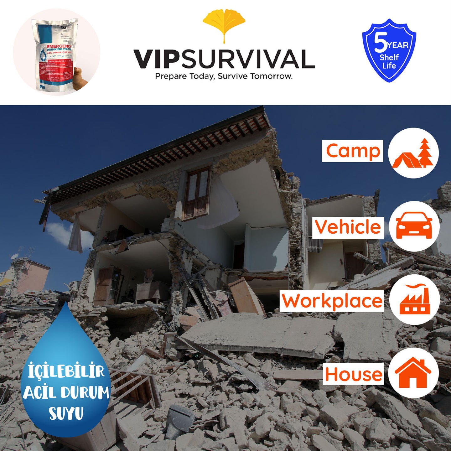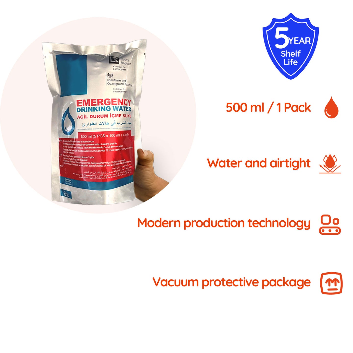 2 water packs are prepared to meet the 72-hour need of 1 person. “MCA” Approved by the UK Maritime Coastguard Agency. Ph : 6,5-9,5 - Conductivity: 20°C 77,3µ S/cm, Turbidity: Suitable, Odor: Suitable, Color: Suitable, Ammonium: Not detected, Aluminum: Not detected, Iron: Not detected - Protected by waterproof vacuum sealed packaging. PrIt is treated with reverse osmosis technique. Each package contains 5 pieces of 100 ml water. Emergency Water has a shelf life of 5 years when stored under appropriate conditions